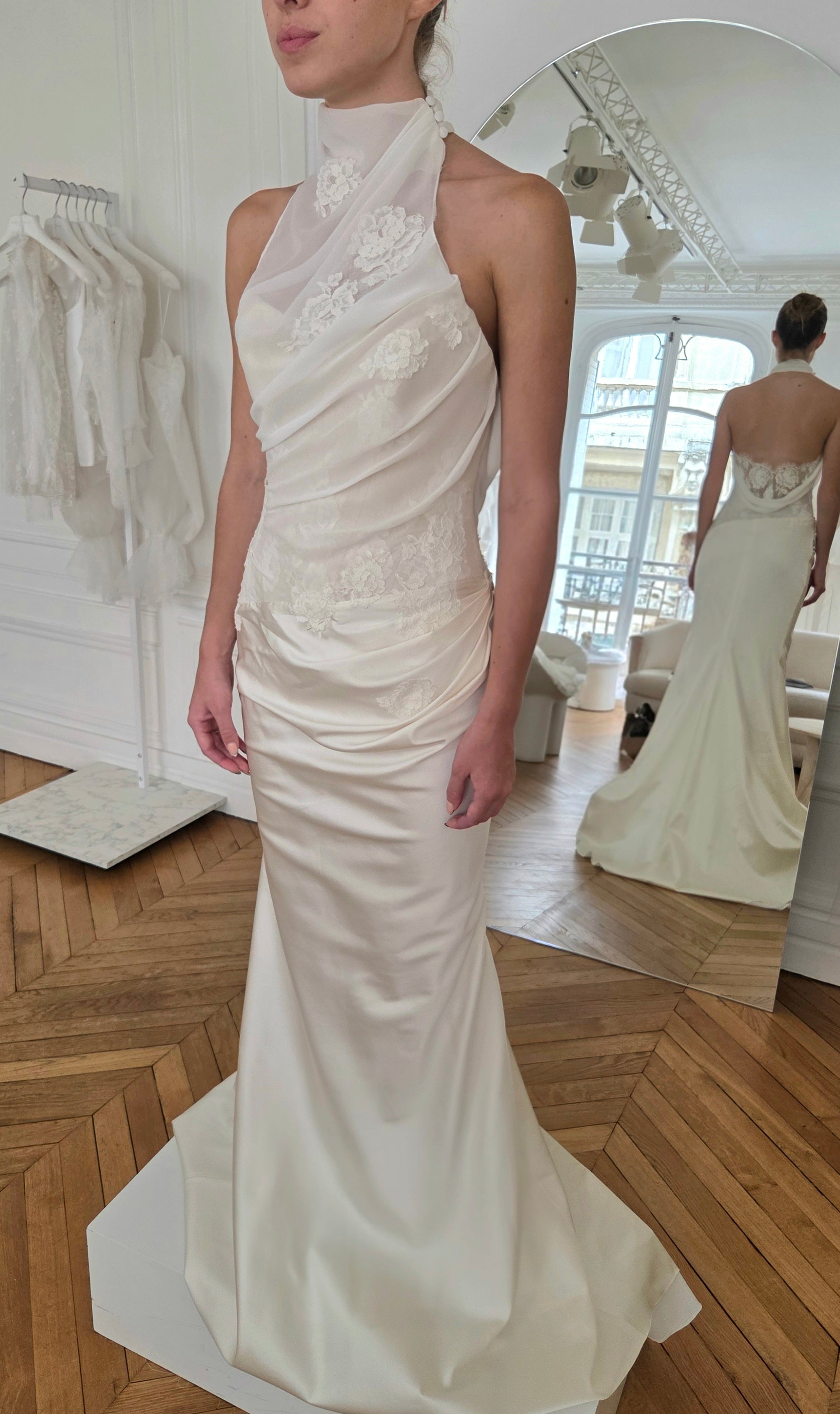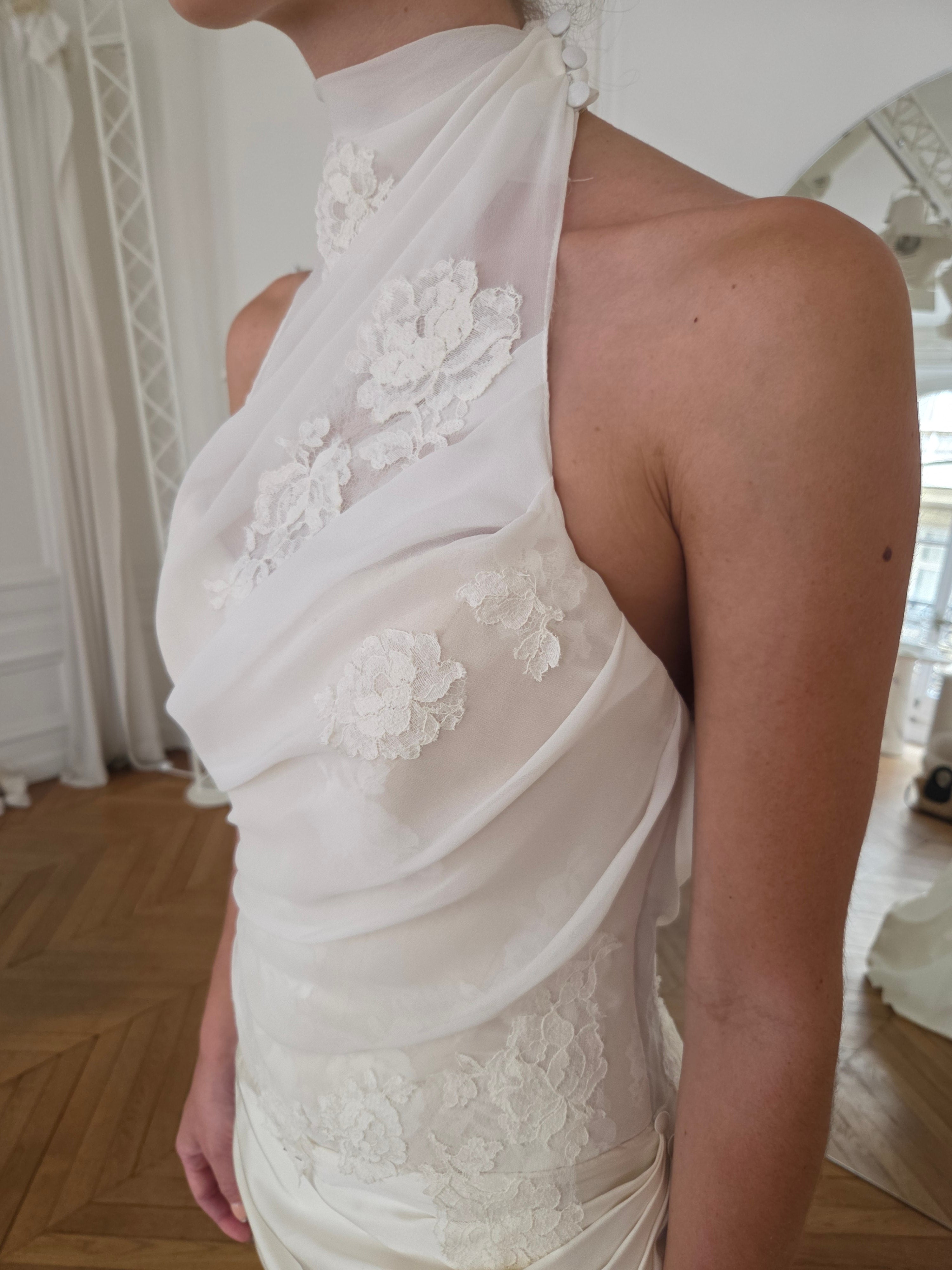 Bianca captivates with its graphic elegance and asymmetry. The draped silk georgette top creates an American neckline with a high collar, revealing a lace bustier underneath with a touch of transparency. The ecru satin crepe skirt hugs the curves, with an asymmetrical drape that enhances movement. Subtly applied French lace patches offer this creation a perfect balance between modernity and refinement.