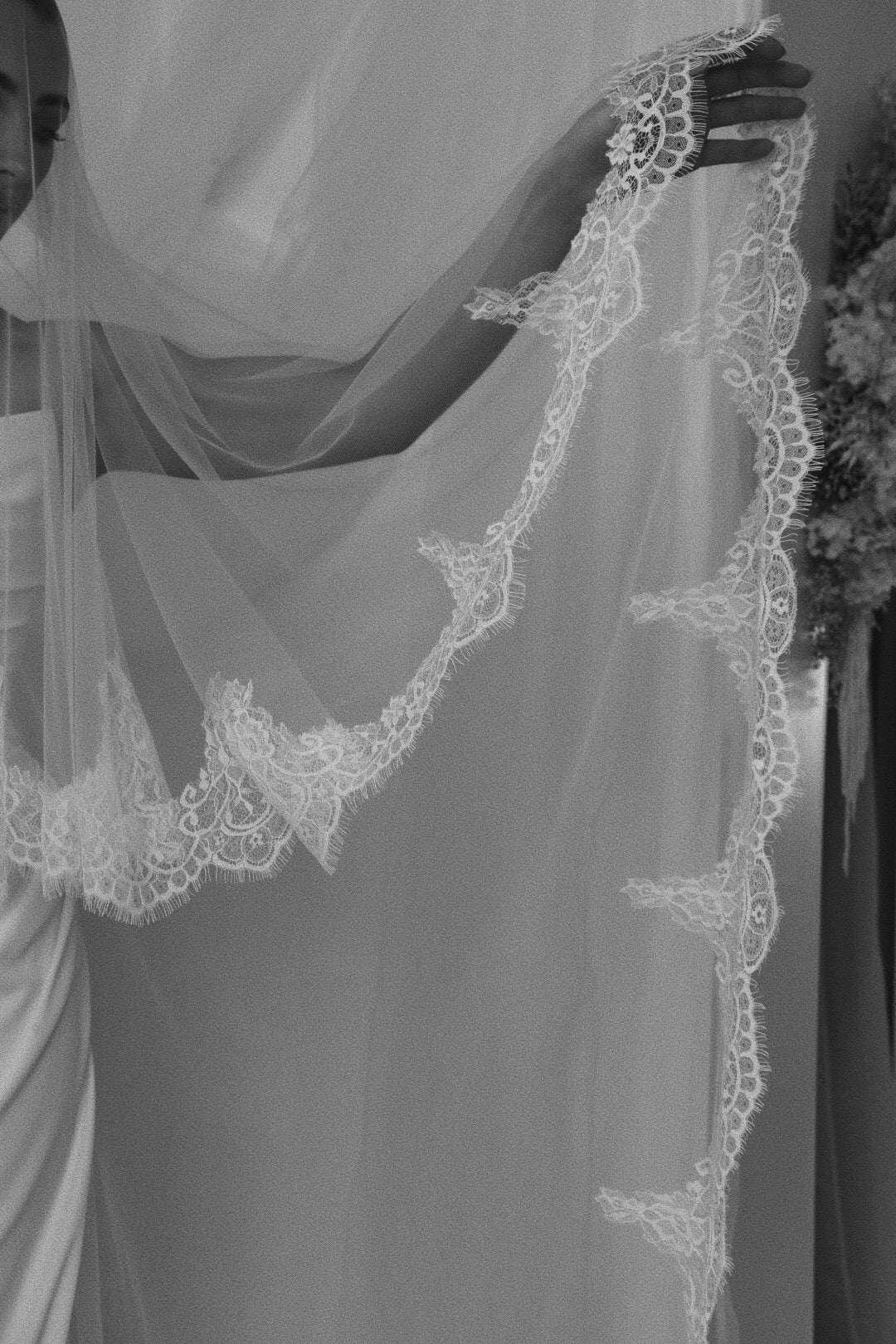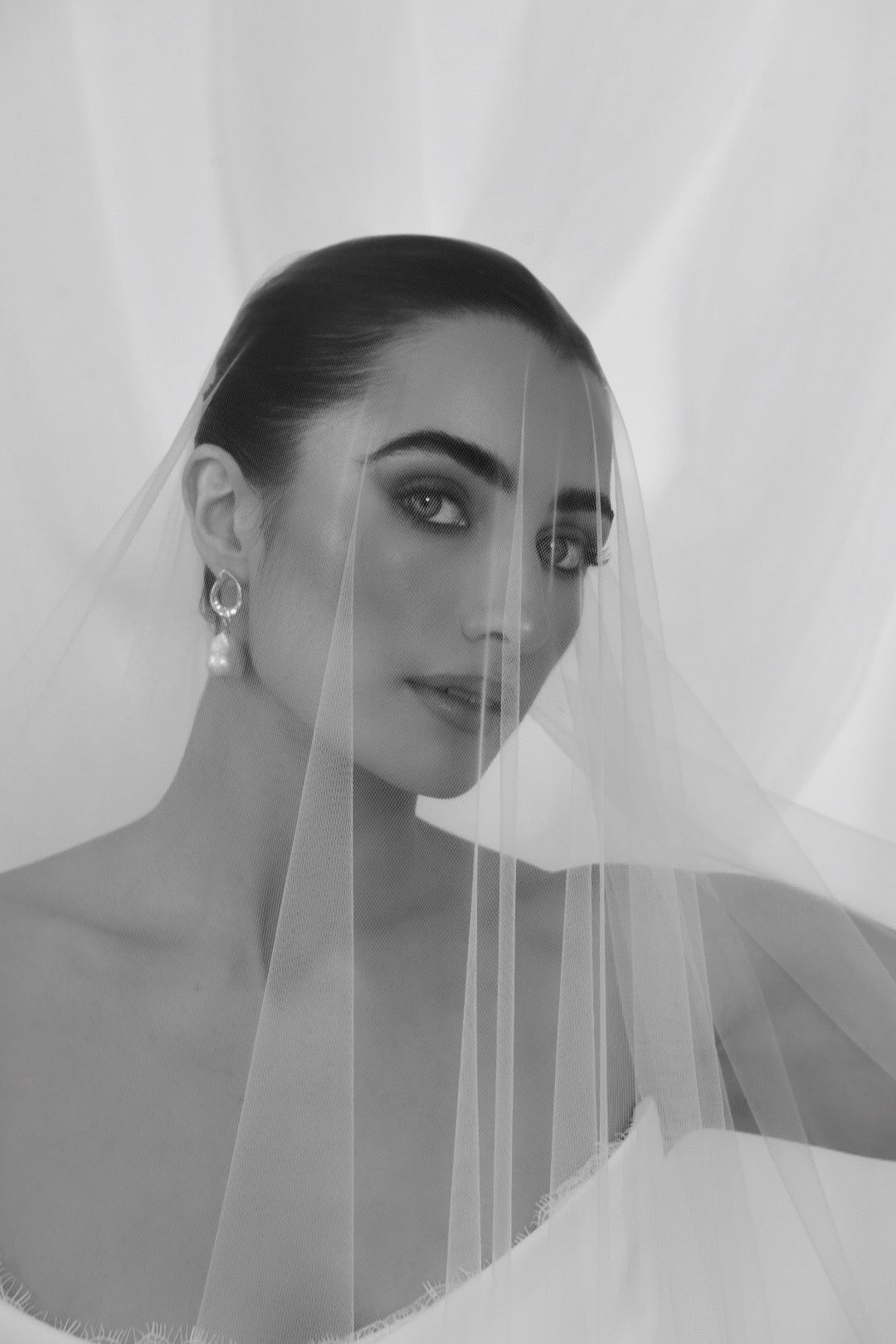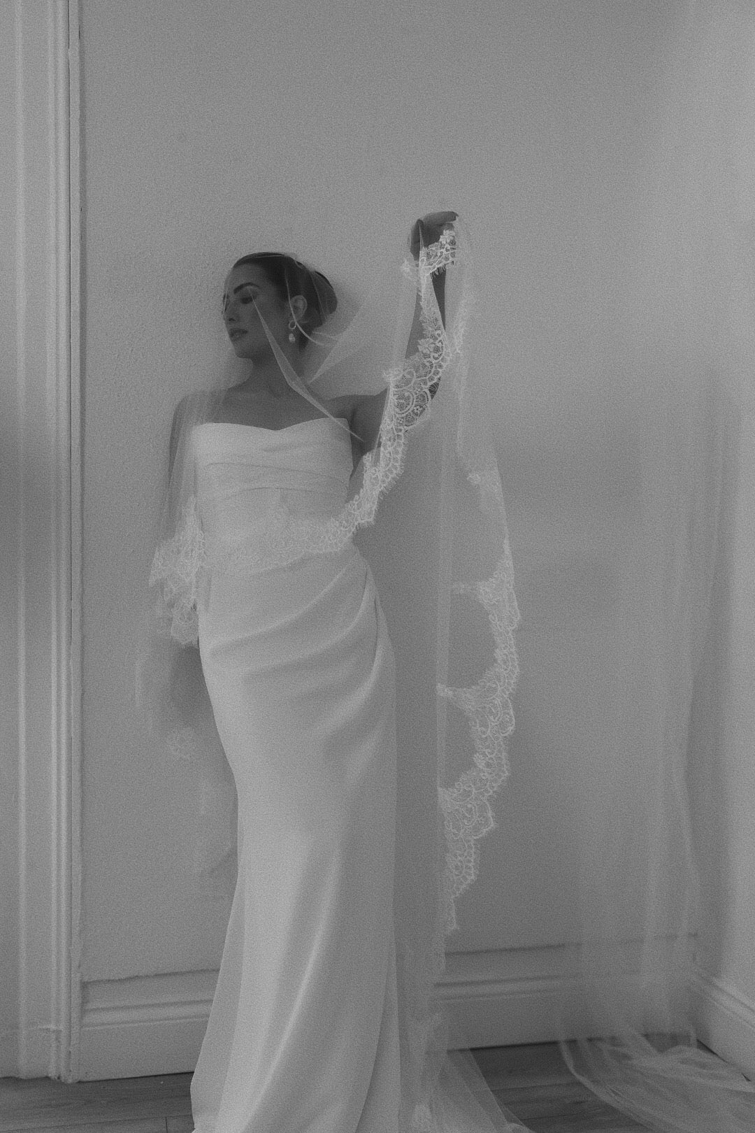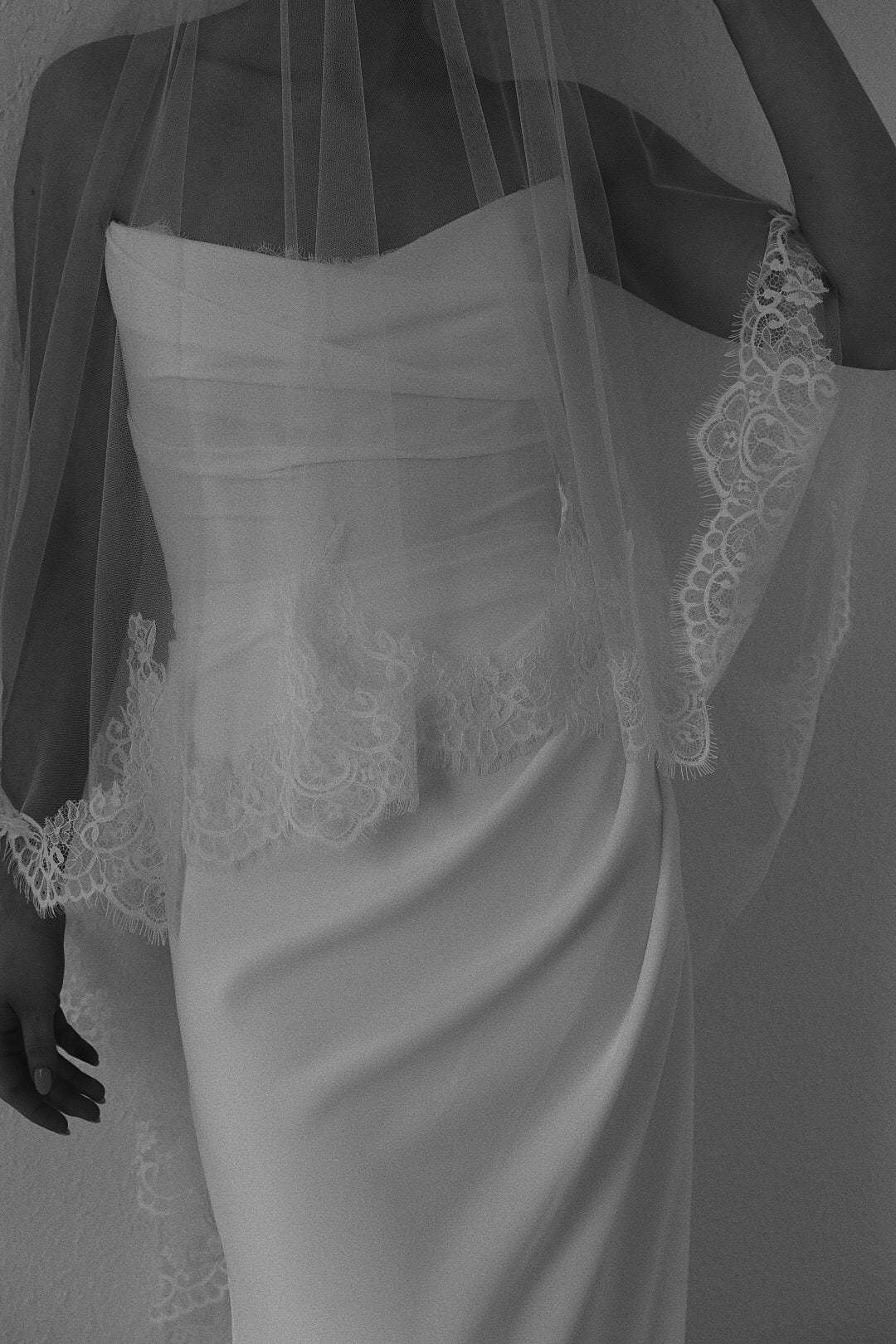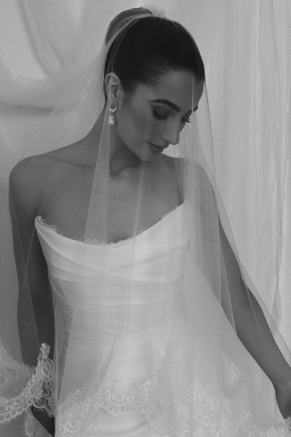 A wide Chantilly lace trim veil made in the softest sheer tulle, the Daphne lace veil can be ordered as a two tier as pictured with blusher layer, as a single layer veil, or as a Mantilla style veil.