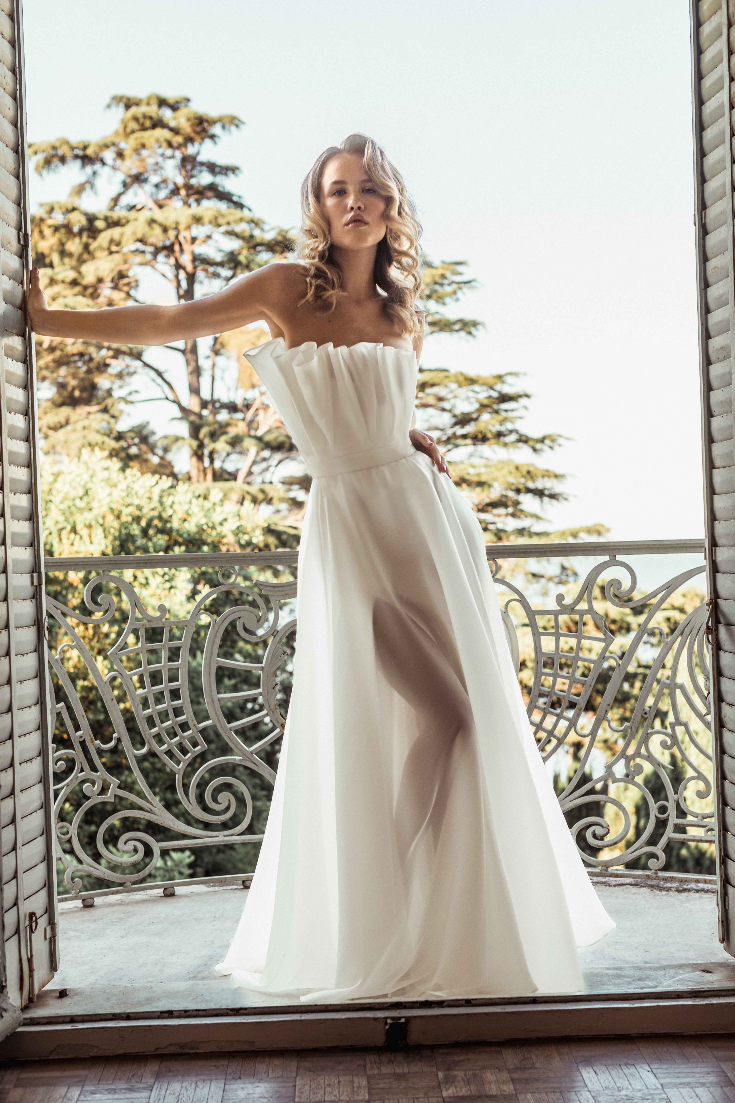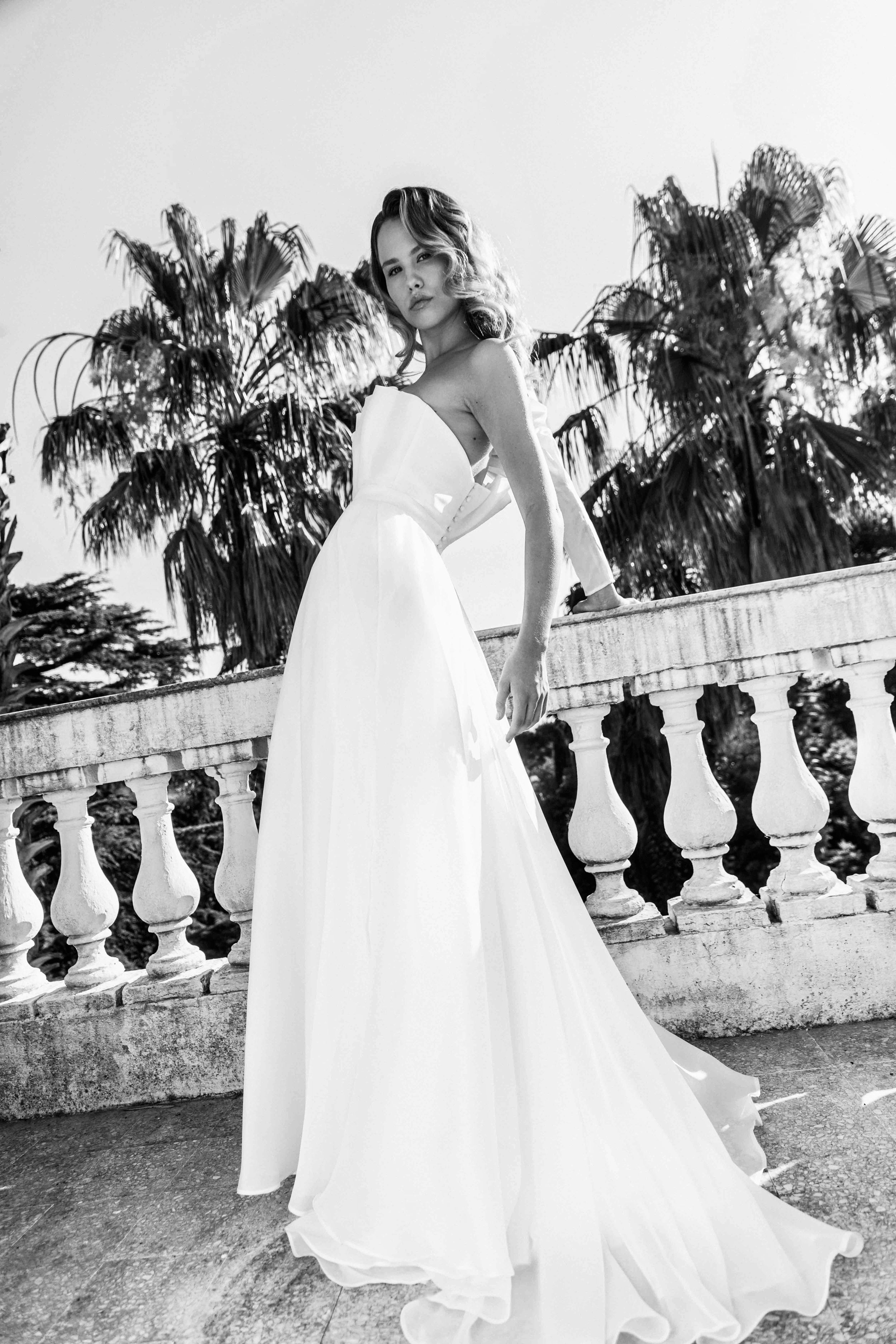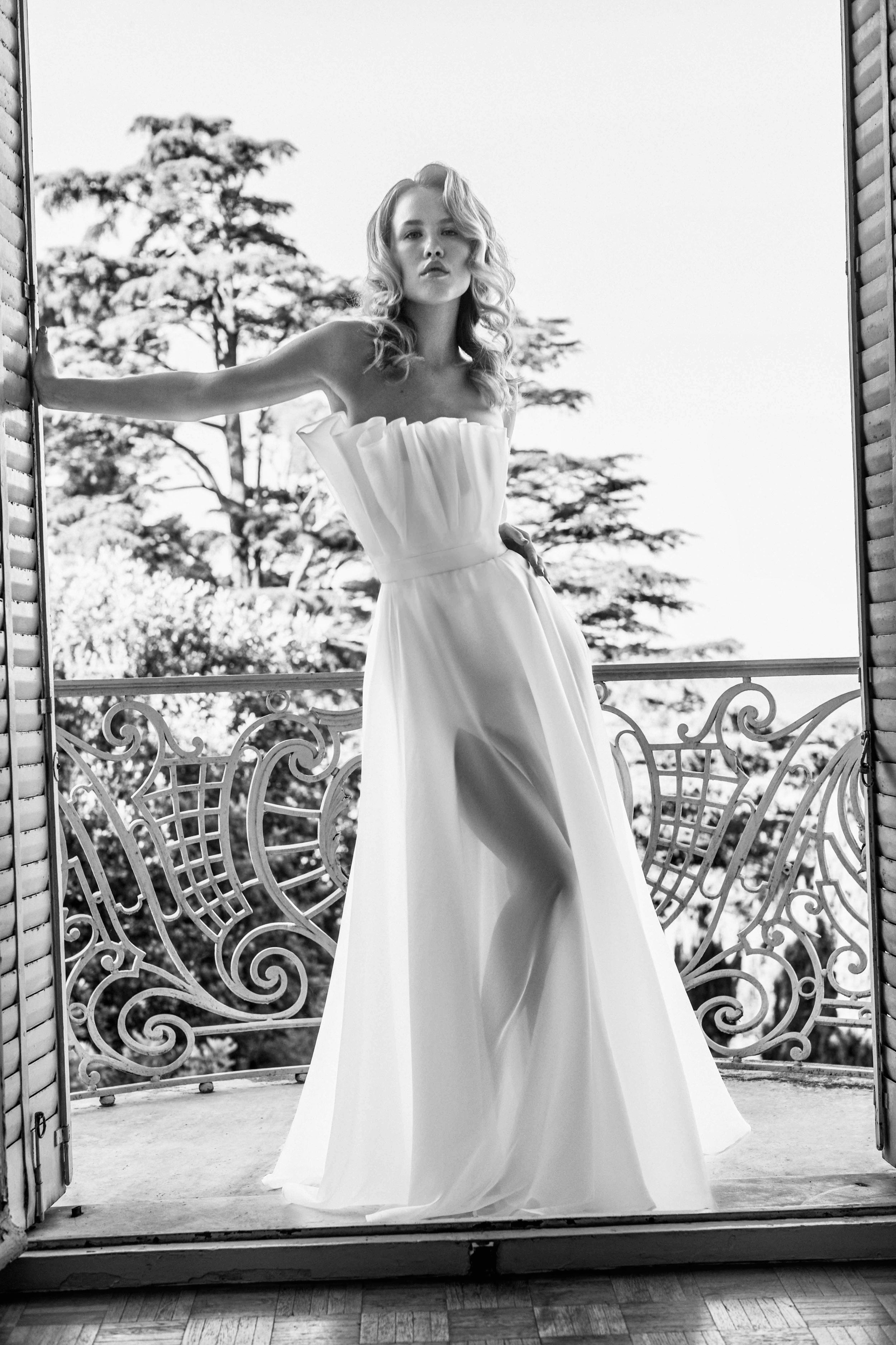 Made of organza and silk crepe, this dress illustrates the elegance of a haute couture wedding dress. Every detail reflects Caroline's unique identifiable style.