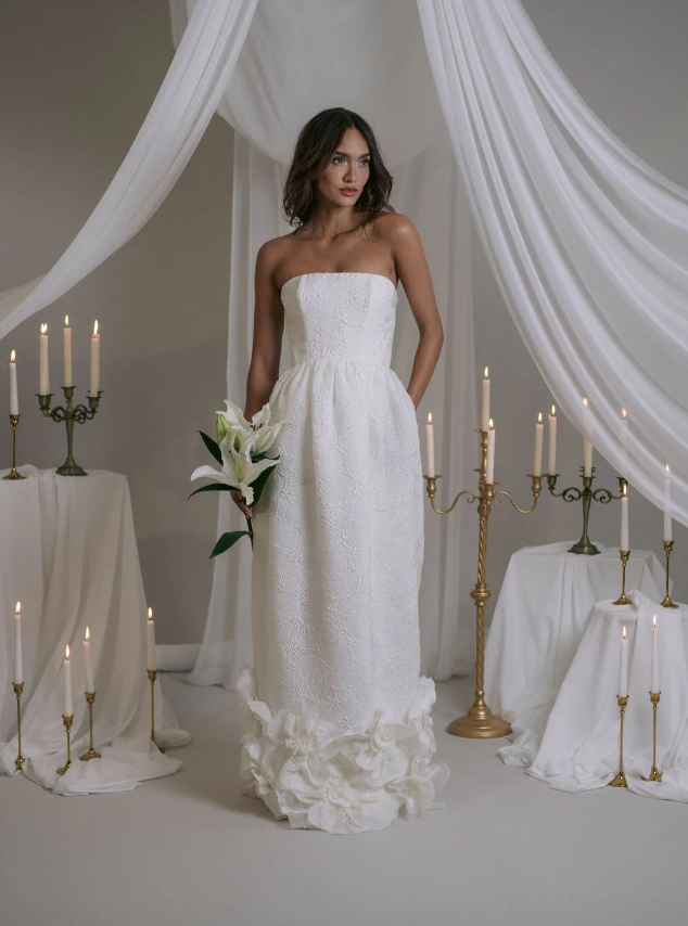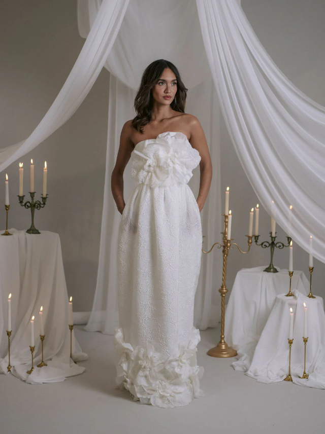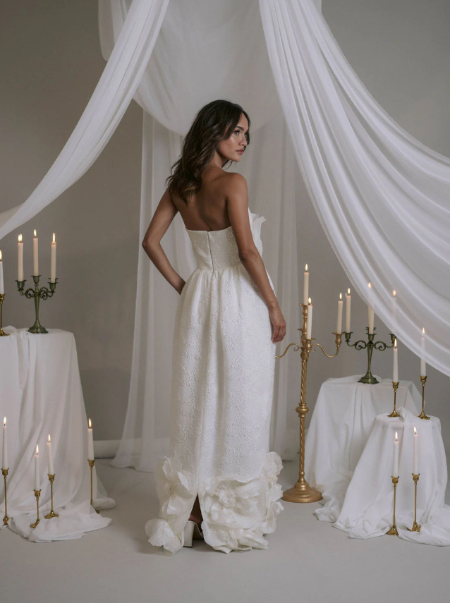 The strapless gown "Violet" features boning and a girdle down to the waist, made from embossed fabric with a camellia motif. It closes discreetly at the back with a zipper. The ball gown skirt is gathered at the waist and includes side pockets. Beneath the embossing, the couture crepe ensures both opacity and structure.
